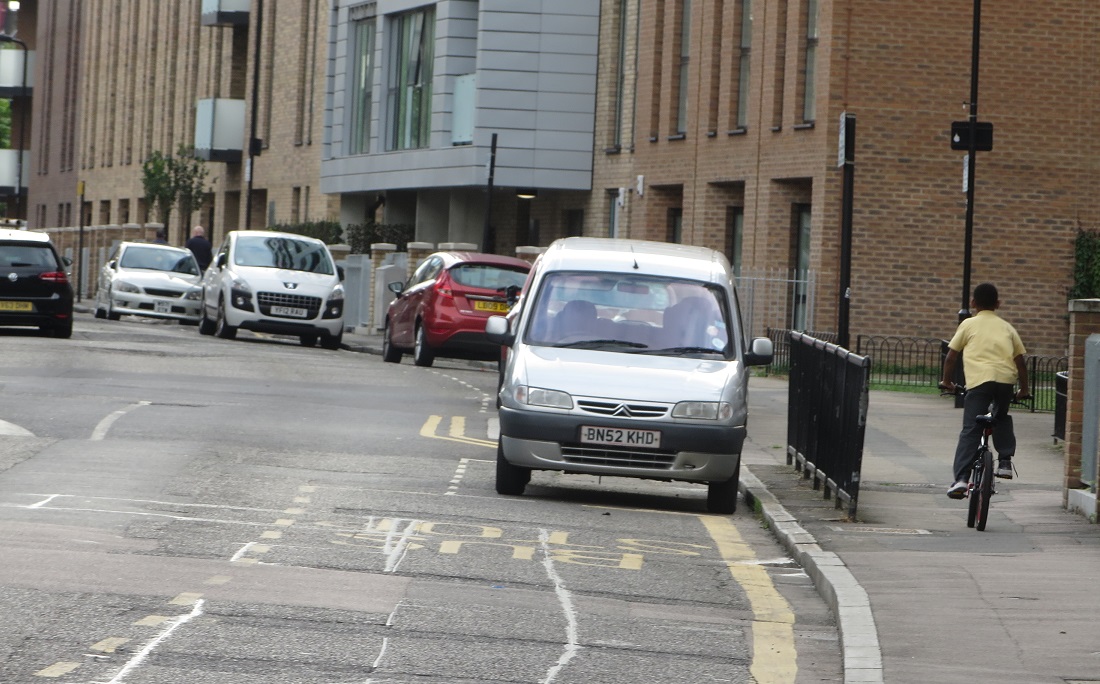 | Car parking along both sides of the carriageway, two wide traffic lanes and a child cycling on a narrow pavement earlier today |